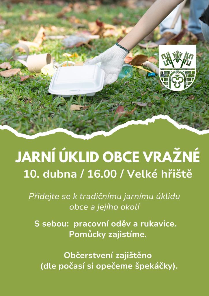 V pátek od 16ti hodin proběhne Jarní úklid obce Vražné. Sraz je na hřišti TJ Sokol. S sebou si vezměte pracovní oděv a rukavice. Občerstvení zajištěno.