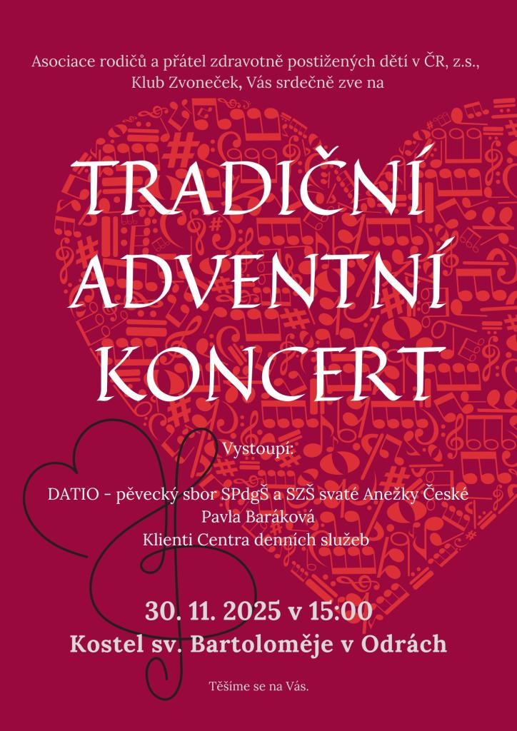 Klub Zvoneček a Asociace rodičů a přátel zdravotně postižených dětí v ČR, z.s. Vás srdečně zvou na setkání, které se uskuteční 30. listopadu 2025 v 15:00. Akce proběhne v Kostele sv. Bartoloměje v Odrách. Vystoupí DATIO - pěvecký sbor SPdgŠ a SZŠ svaté Anežky České, Pavla Baráková a klienti Centra denních služeb.